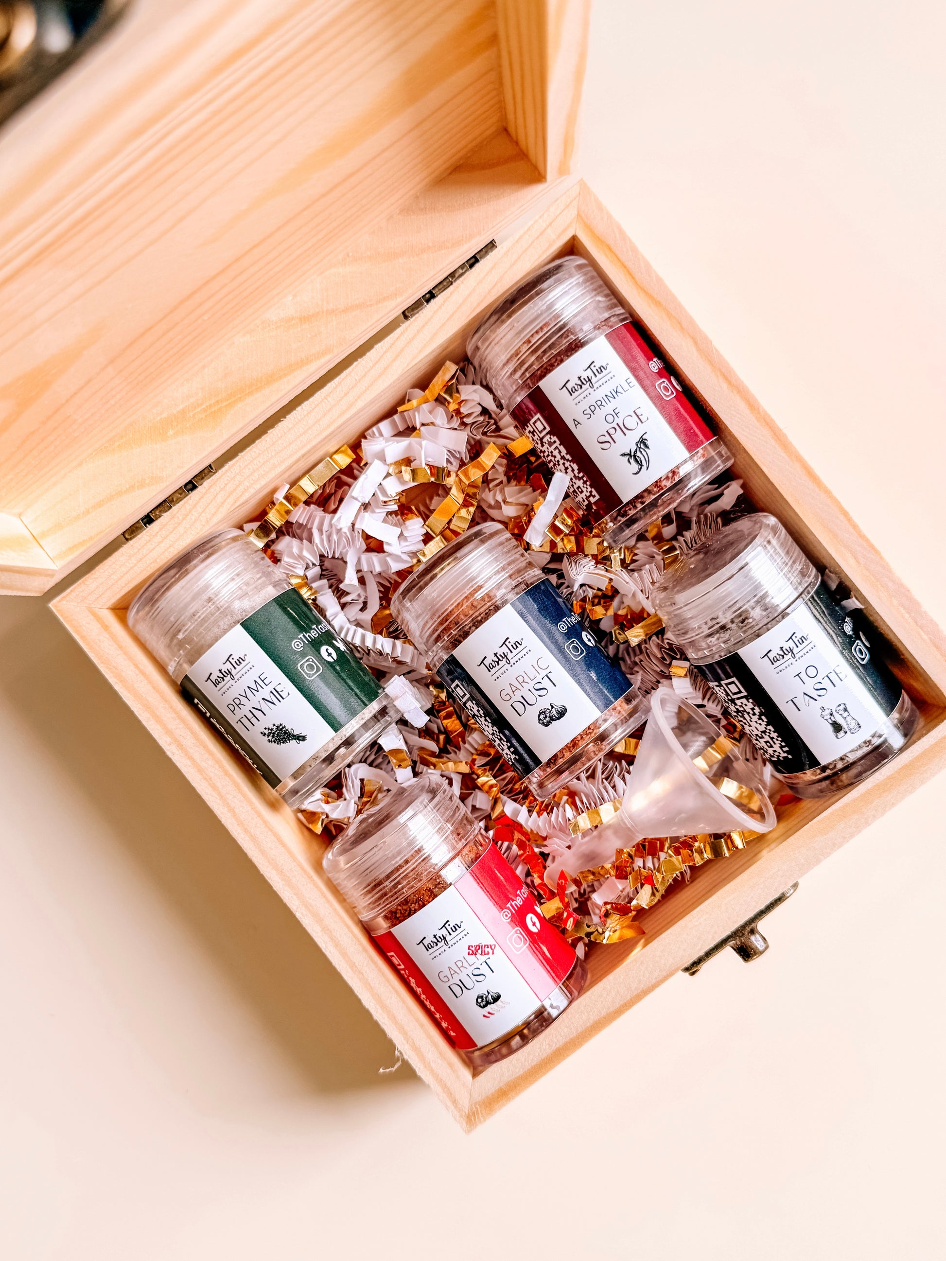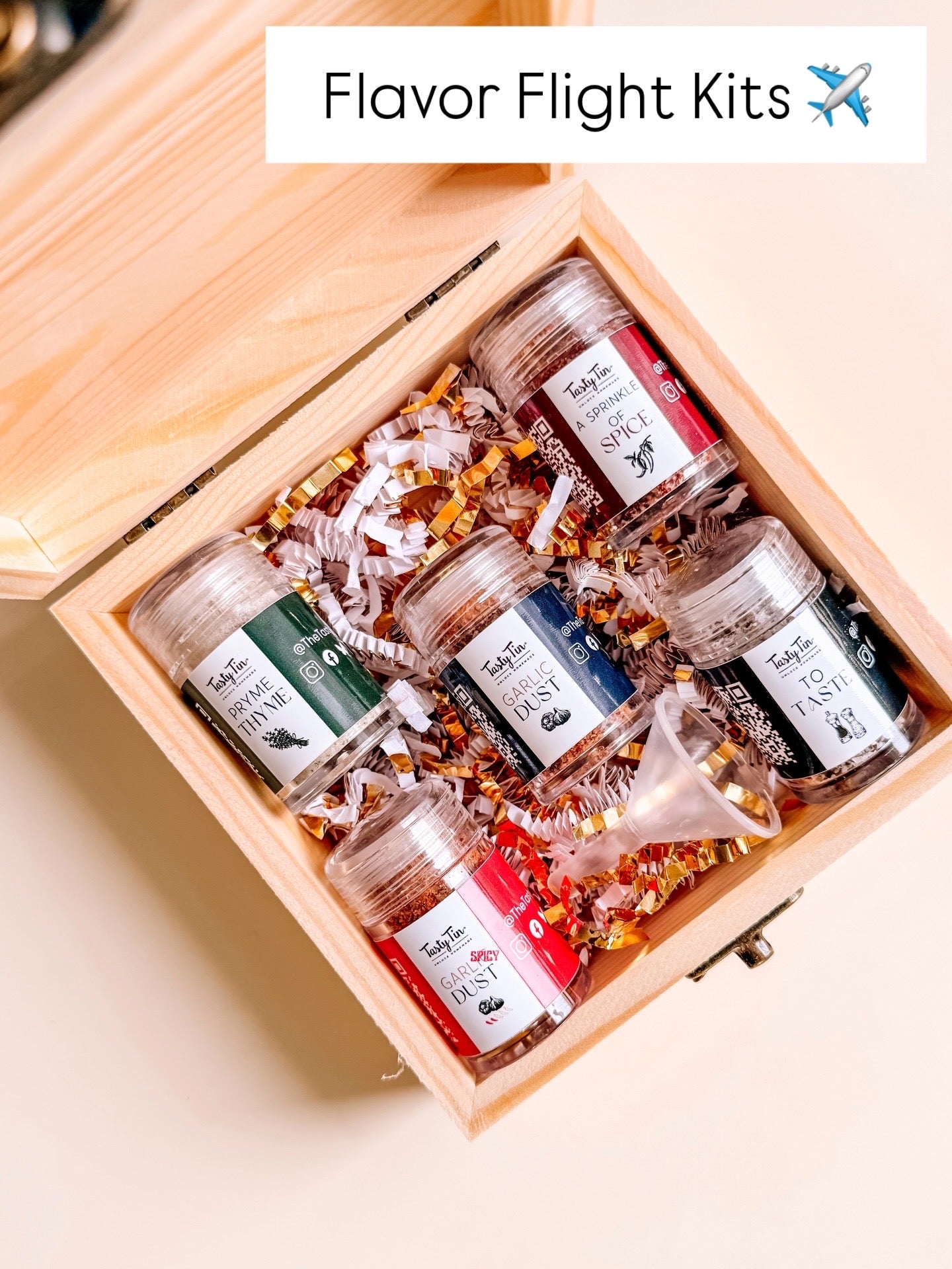 Inside a gift-ready wood box, you'll find all five of our signature Tasty Tin blends in perfectly portable mini sizes. It's easy to wrap, easy to add a bow to, and just right for birthdays, thank-yous, hostess gifts, or celebrating a travel-loving friend who appreciates good food.